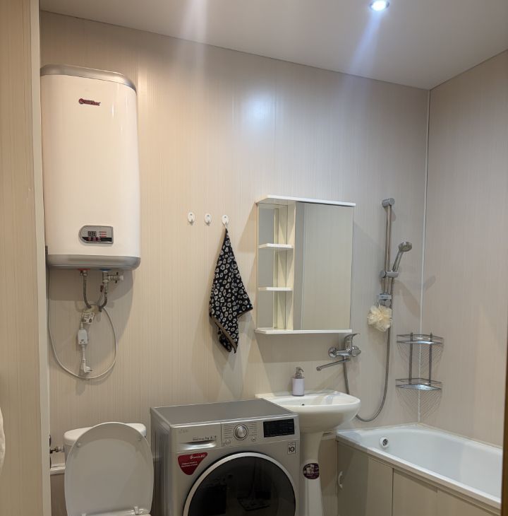Есть кондиционер, водонагреватель, кухонный гарнитур со встраиваемой техникой,а также другая мебель.