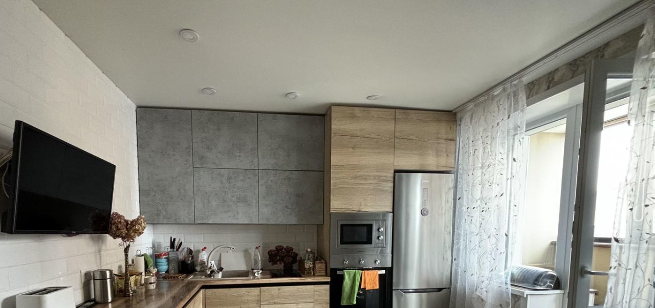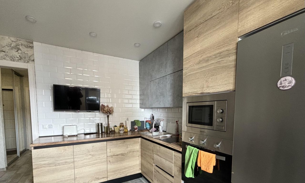 Кухня оборудована современной техникой: посудомоечная машина 60см, встроенный духовой шкаф и микроволновая печь, электрическая плита,холодильник.