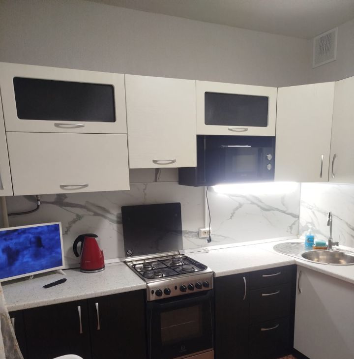 Кухня оснащена современной техникой: холодильник, газовая плита и микроволновая печь. В квартире установлен кондиционер. Санузел раздельный, оснащен стиральной машиной.
