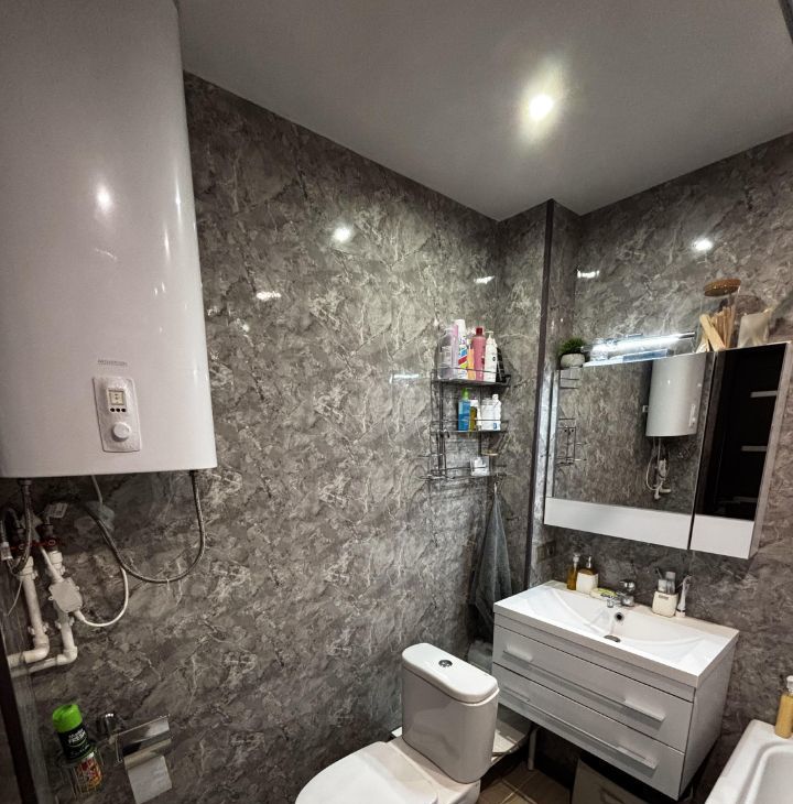 Остается кухонный гарнитур,стол,стулья,духовой шкаф и плита Bosch. 2 кондиционера(на балконе и в комнате),водонагреватель,мебель в прихожей.