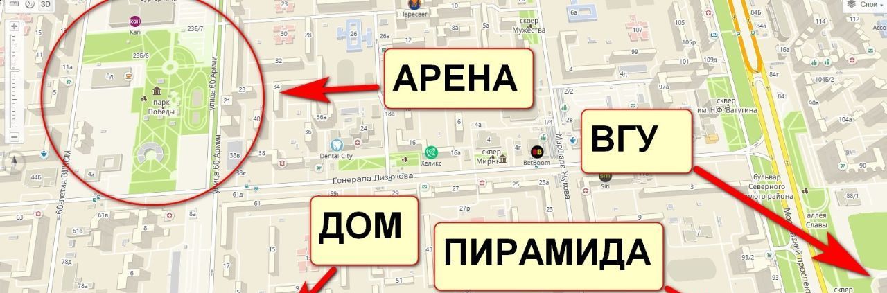 Квартира, ВГУ, Арена,Хользунова, Пирамида, Жукова, памятник Славы, Лизюкова, парк Победы, 60 Армии
