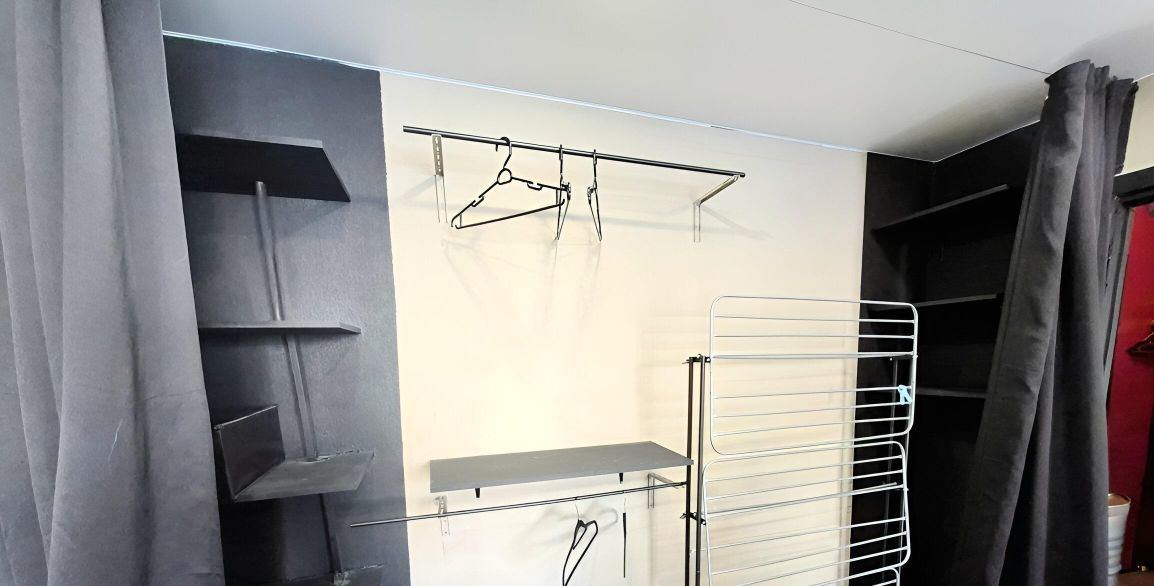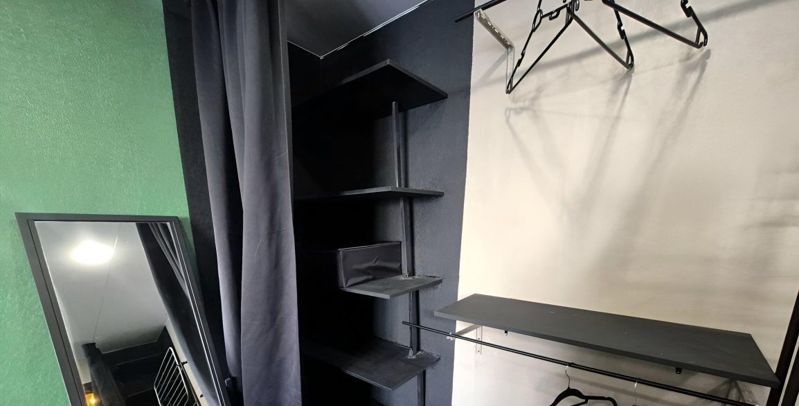 - Жилая комната: 19.7 кв.м — просторная, с зонированием (спальня + гостиная + гардеробная + рабочая зона)