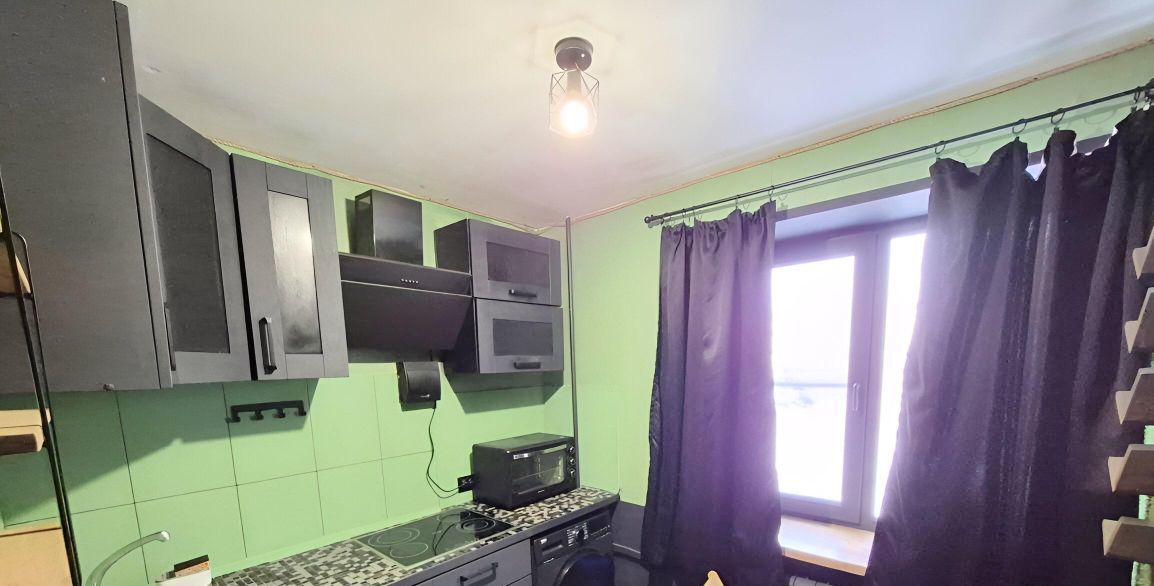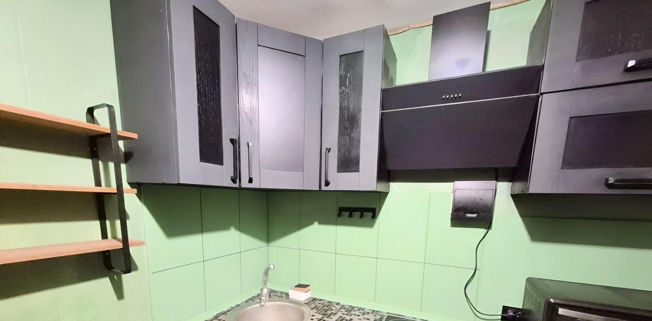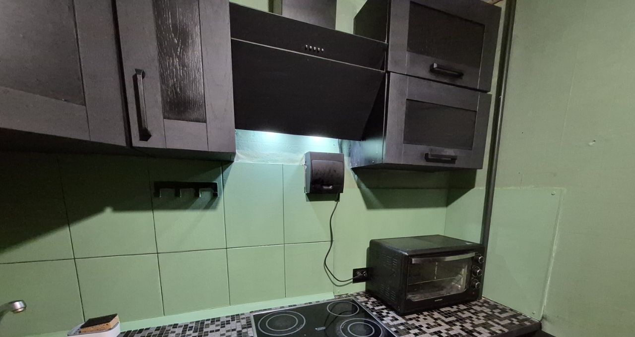 - Встроенная кухня с техникой (плита, вытяжка, духовка, холодильник, стиральная машина)
