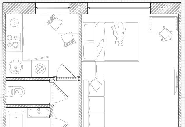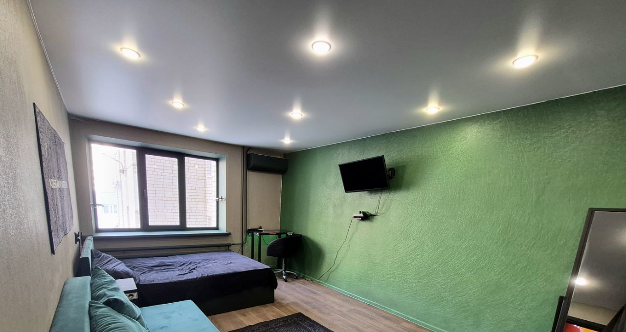 - Стильная зона отдыха с диваном, кроватью и рабочим местом