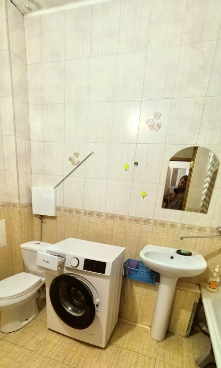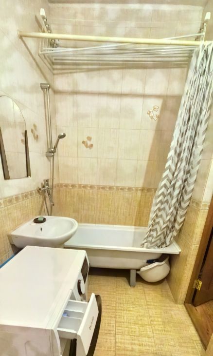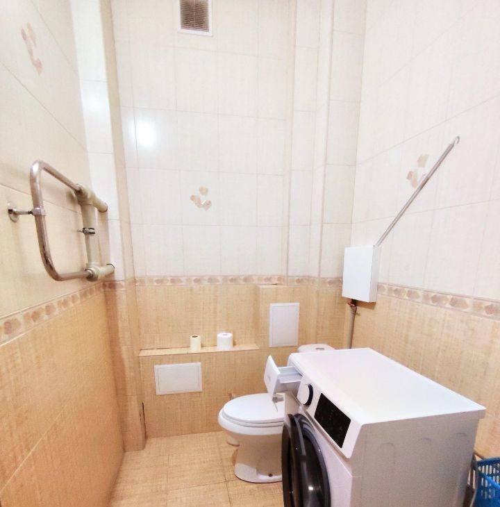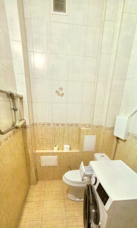 Большой совмещенный санузел, оснащён ванной, сушилкой для белья, раковиной, унитазом и современной стиральной машиной.