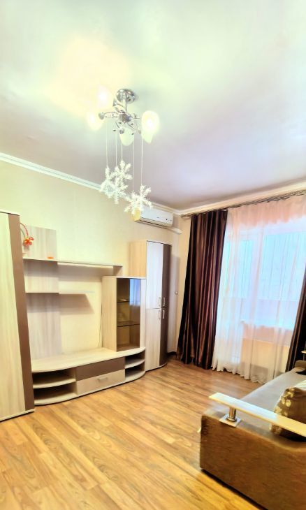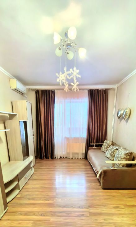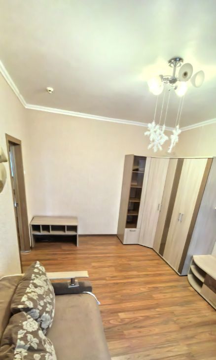 В комнате установлен кондиционер, есть вместительные шкафы, журнальный столик и диван, что позволяет комфортно разместиться самим и разместить все необходимое.