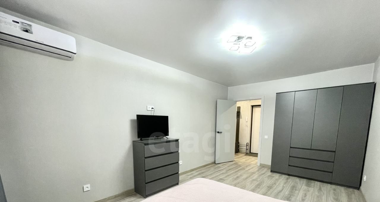 В квартире имеется просторная жилая комната, в которой установлены необходимая мебель и техника для комфортного проживания: кондиционер, двуспальная кровать с матрасом, прикроватные тумбы, шкаф.