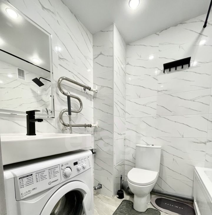 Санузел совмещен: унитаз, ванная, стиральная машина, зеркало, умывальник.