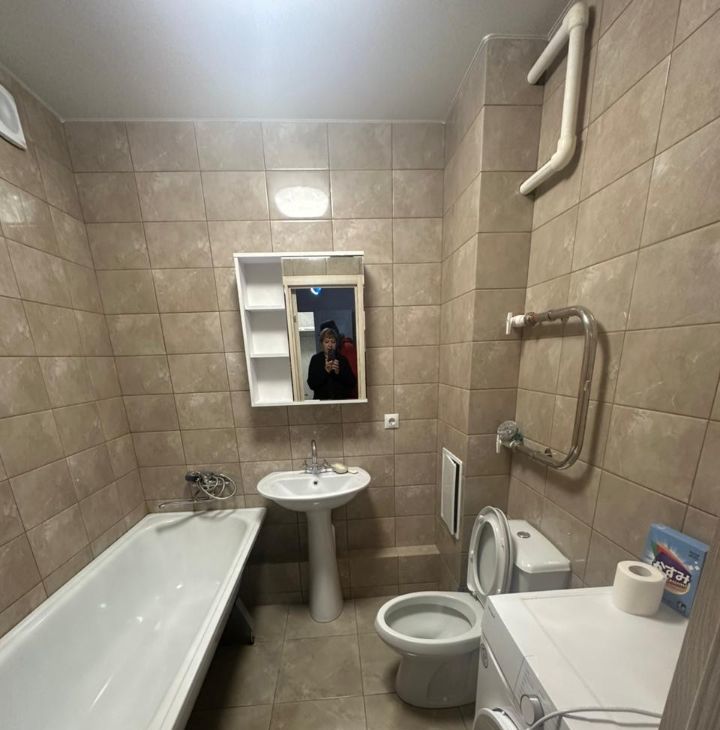 Санузел совмещенный, оснащен всем необходимым. Из окон открывается вид на город, а балкон предоставляет дополнительное пространство для отдыха.