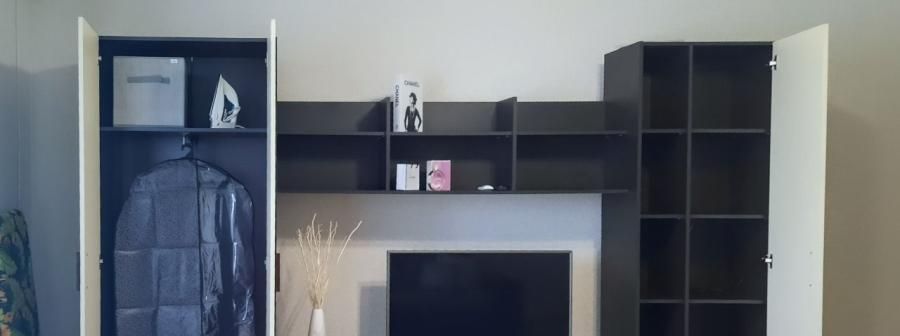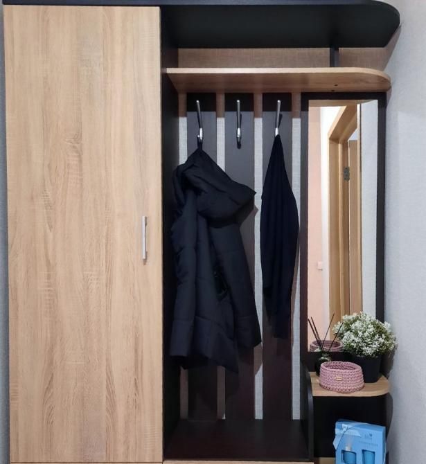 Кухонная мебель, техника( холодильник, кондиционер, стиральная машинка, микроволновая печь, газовая плита с духовым шкафом, эл.чайник), посуда, столовые приборы. В комнате диван, стенка, смарт-телевизор, шкаф купе. В коридоре прихожая. Так же есть: утюг, новый пылесос, гл.доска.