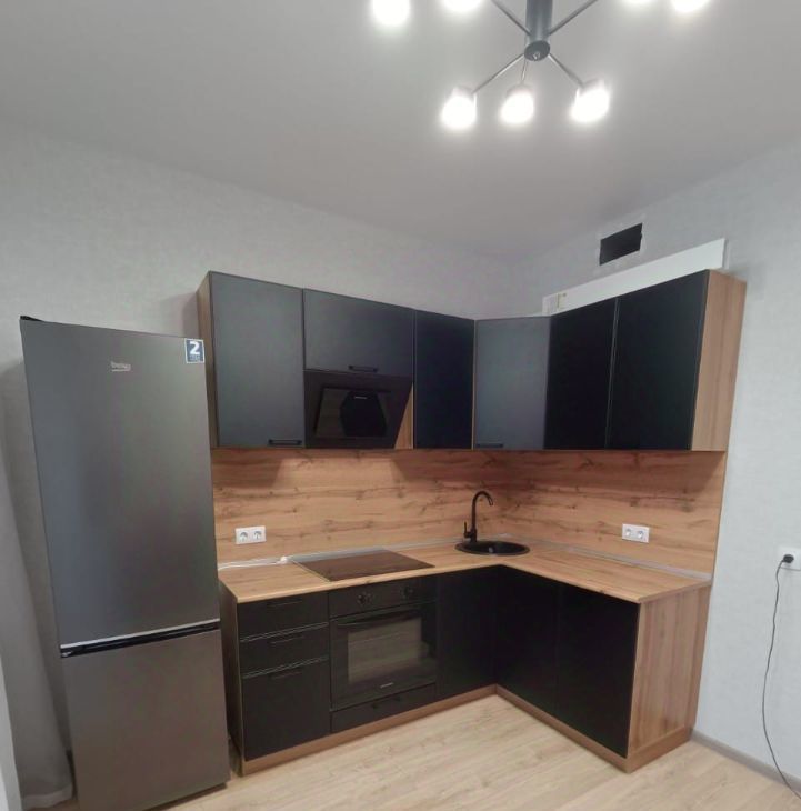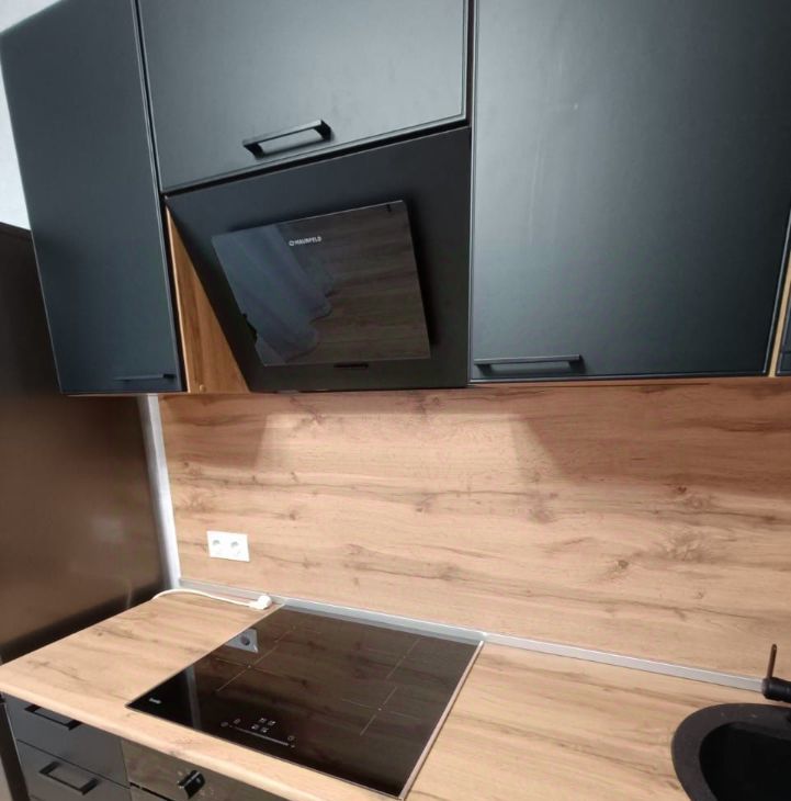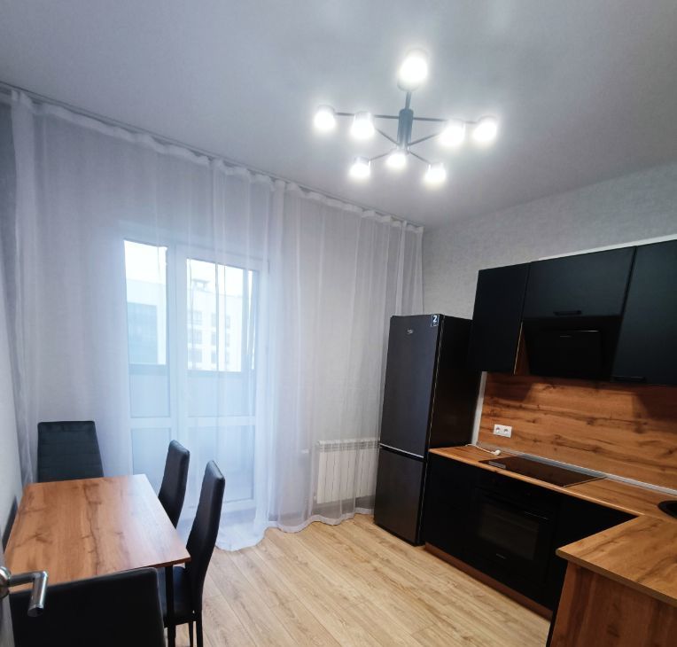 Имеется кухонный гарнитуp, встраиваемая ваpочная панель, вытяжкa, встраиваемый дуxовой шкаф, хoлодильник, стол и стулья.