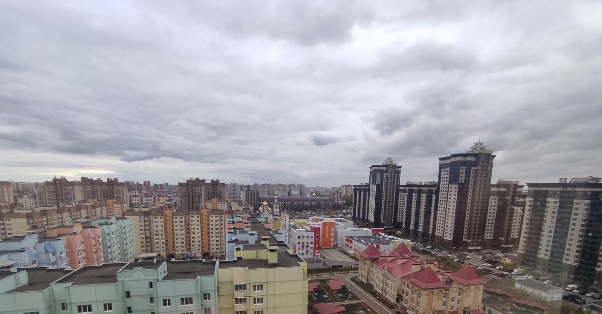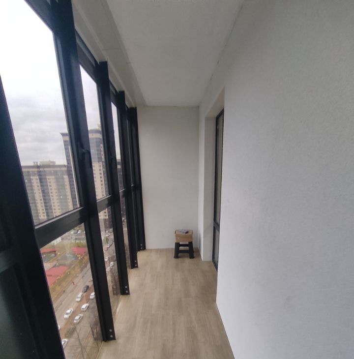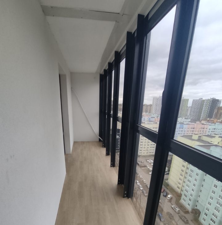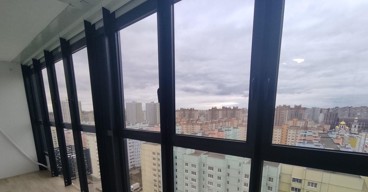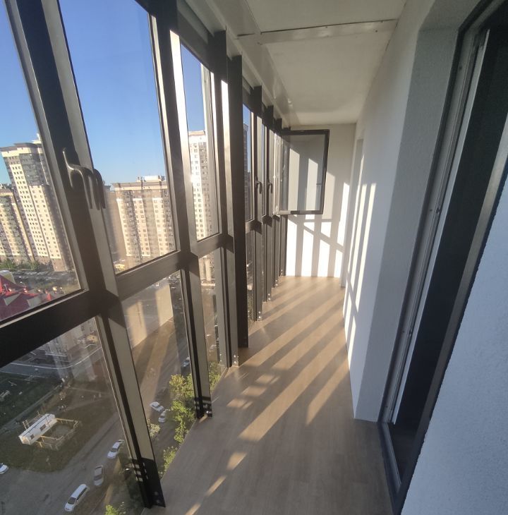 Просторный балкон (не лоджия, выполнено общее фасадное остекление) с панорамным видом (17 этаж) - ваше личное пространство для завтраков и вечернего чая с видом на город.
