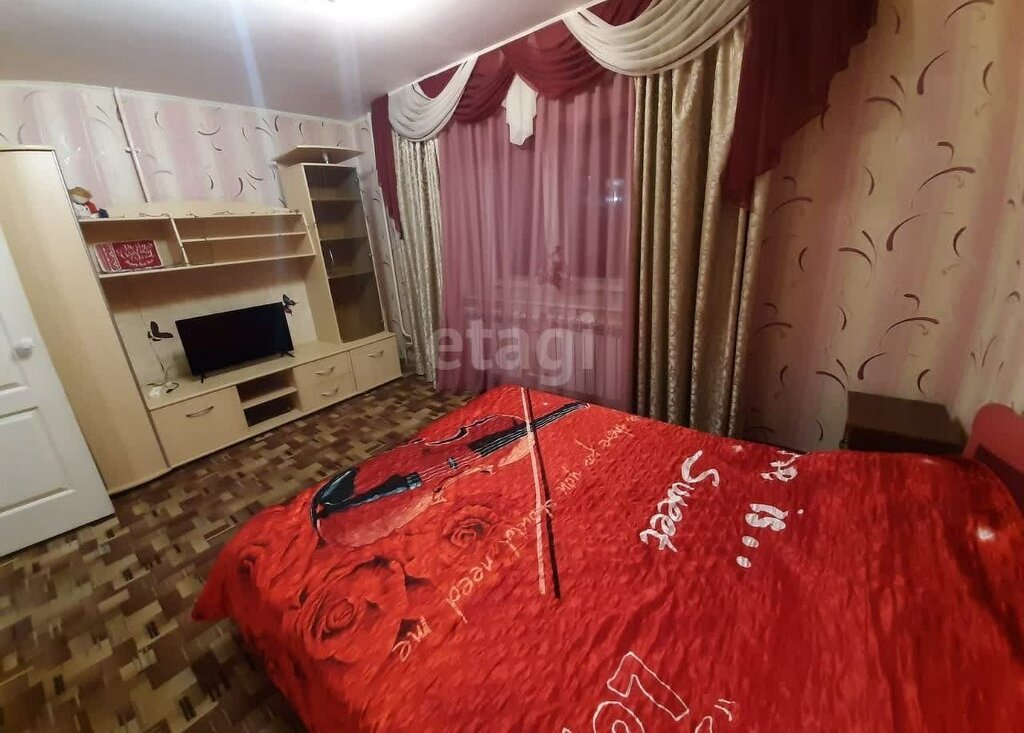 В квартире имеется просторная жилая комната, в которой установлены необходимая мебель и техника для комфортного проживания: телевизор, кровать, тумба под ТВ/шкаф.