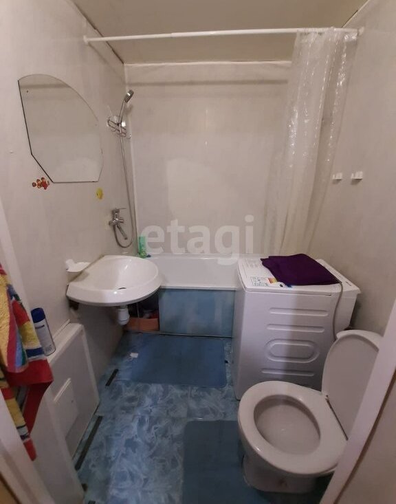 Санузел совмещен: унитаз, ванная, стиральная машина, зеркало, умывальник.