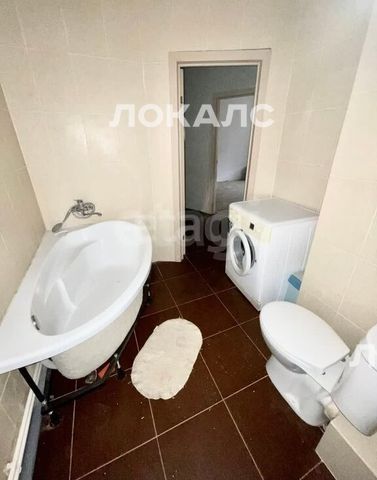 Санузел совмещен: унитаз, ванная, стиральная машина, зеркало, умывальник.