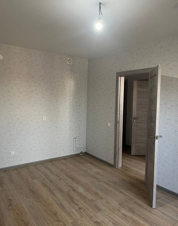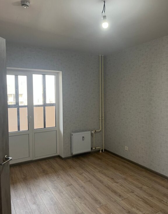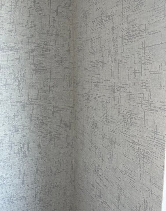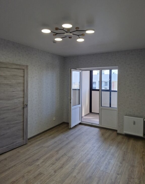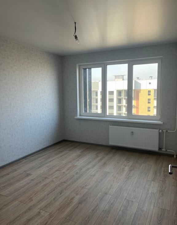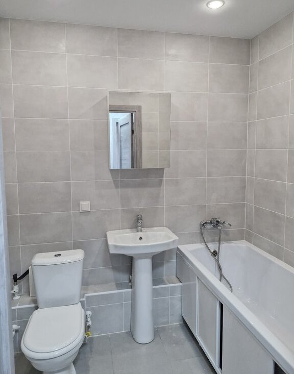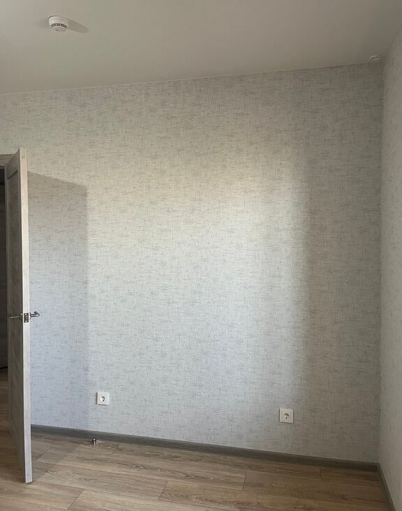 В квартире хороший ремонт от застройщика, светлые обои (серо-голубые) и серая плитка в санузле.