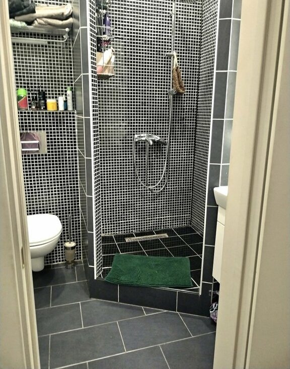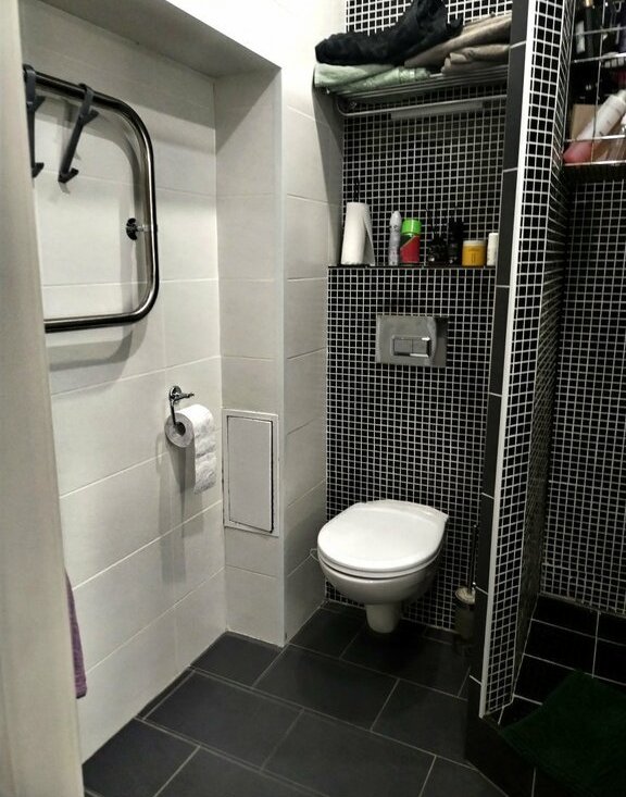В сан. узле современный кафель, инсталляция.