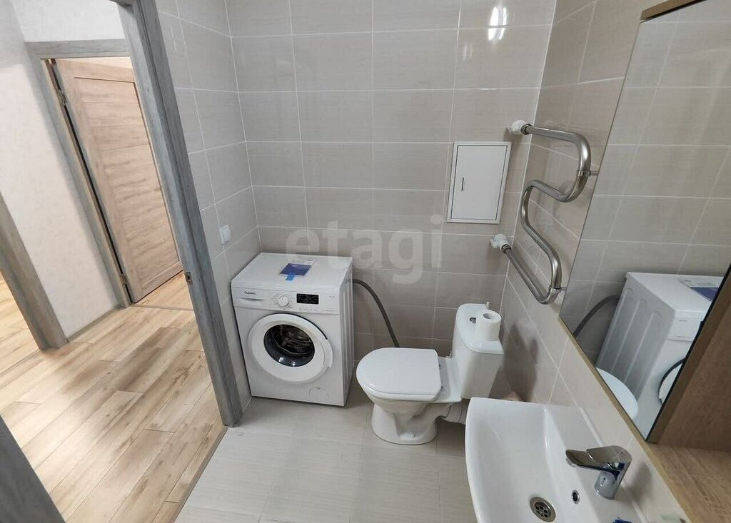В квартире есть все для комфортного проживания: холодильник, плита, стиральная машина, кровать, кухонный гарнитур.
