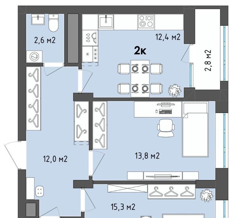 Площадь: 61,1 кв.м. — просторная и функциональная двушка.