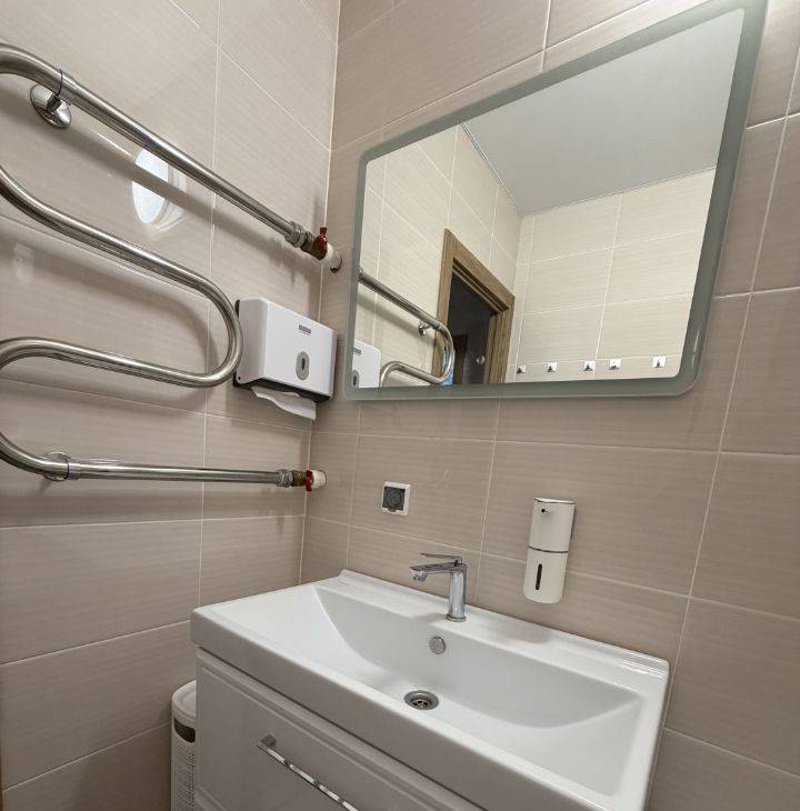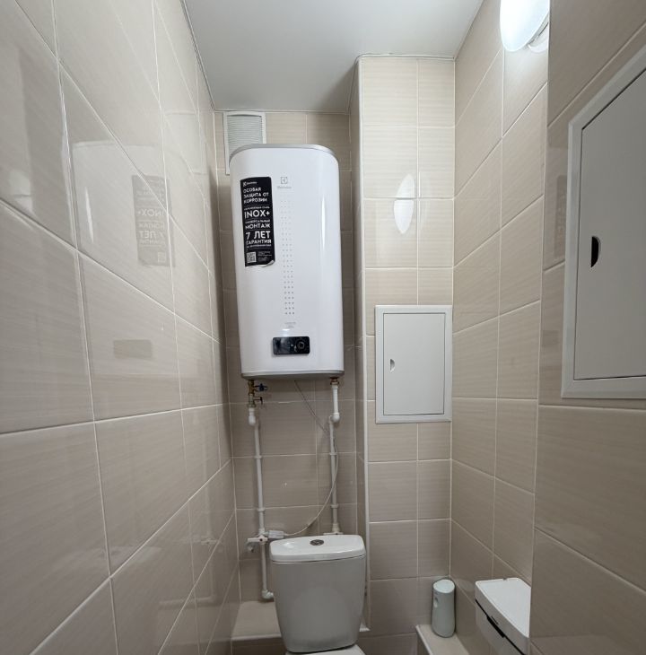 Санузел раздельный, отделка плиткой и установлен водонагреватель, тумба с раковиной и зеркало с подсветкой.