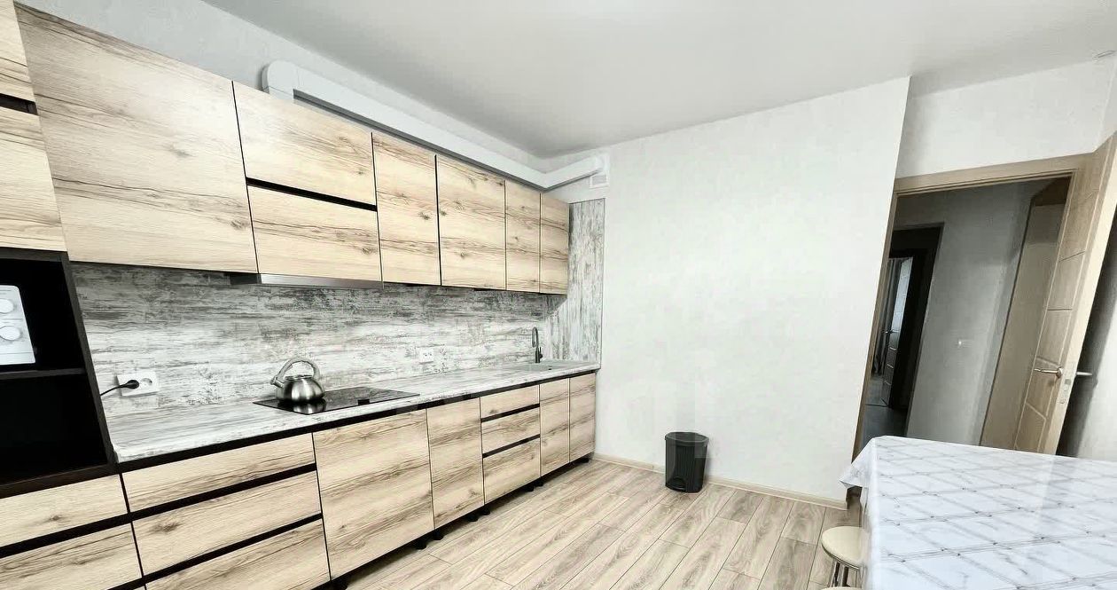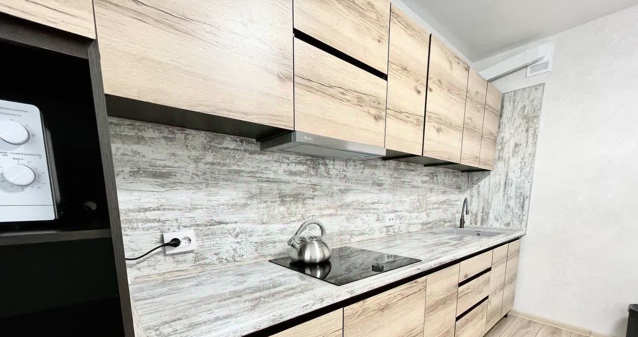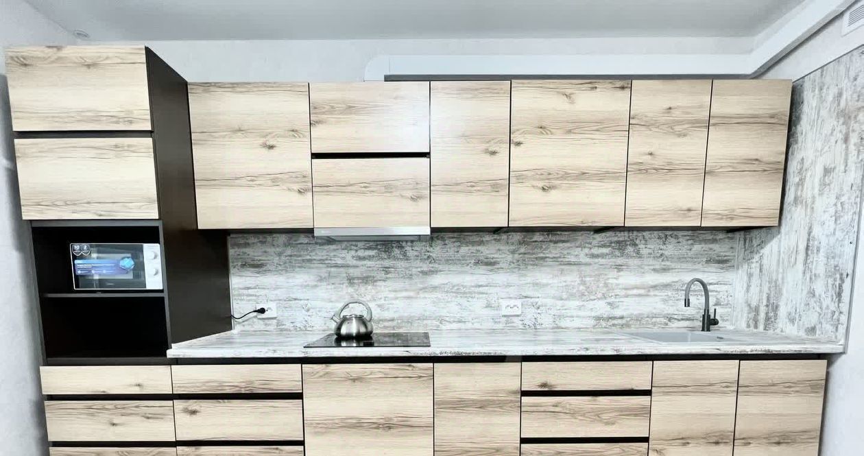 Также имеется отдельная кухня, полностью оборудованная всей необходимой бытовой техникой и мебелью: индукционная варочная панель, вытяжка, чайник, микроволновка, холодильник, кухонный гарнитур, стол, стулья.