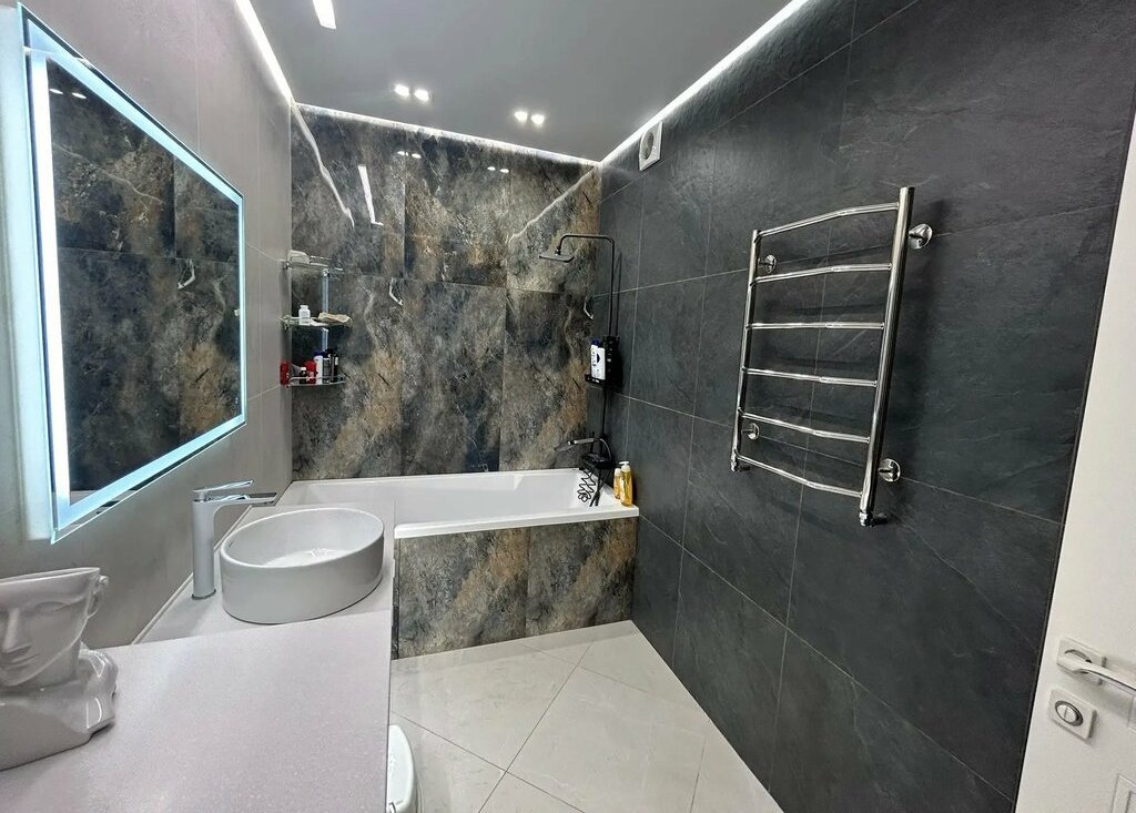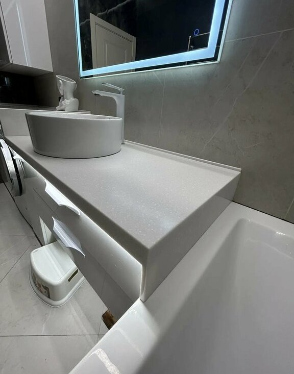 В ванной комнате каменная столешница под заказ. Большая комфортная ванна.
