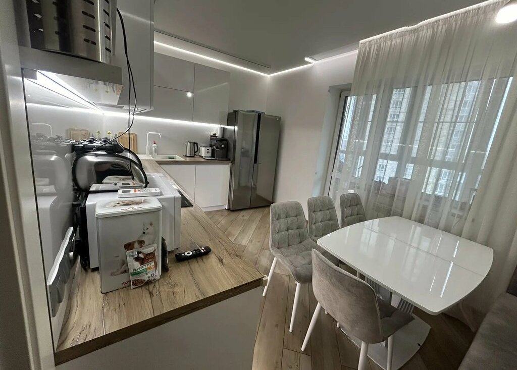 На кухне остается кухонный гарнитур со встроенной техникой.