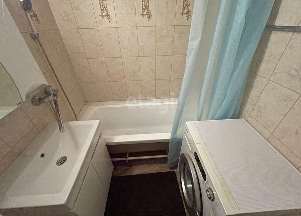 Санузел раздельный: унитаз, ванная, стиральная машина, зеркало, умывальник.