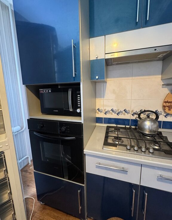 Кухня: холодильник, вытяжка, духовка, варочная поверхность и микроволновка.